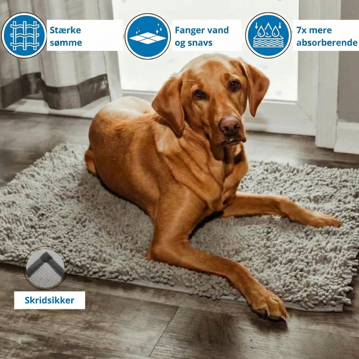 - 60 × 90 cm: Til store hunderacer eller store entréer (f.eks. Golden Retriever, Schæferhund, Labrador).