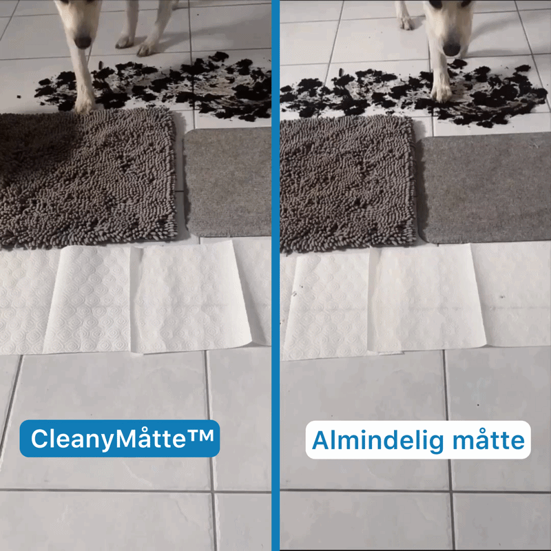 Kommer din hund ofte ind med våde, mudrede poter og forvandler dit rene gulv til et mudderbad? Beskyt dine gulve nu. I modsætning til almindelige måtter, suger vores CleanyMåtte™ op til 7 gange mere vand og snavs. Resultatet? Tørre poter og et skinnende rent hjem – hver dag.